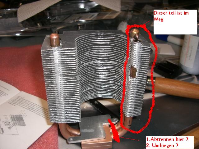 Auf keinen Fall Abtrennen!!! Sind ja Heatpipes und wenn da mal das Zeug rausläuft, was die Wärme leitet isses virbei mit der Kühlleistung. Biegen ist demnach auch schlecht. Ich würde mal schauen ob ich den Kühler nicht in einer anderen Position anbringen könnte.