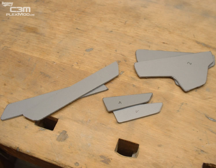 ich hatte beim C3 im hinteren Bereich so Flammen auf das MDF gesetzt gehabt, sahen natürlich ganz geil aus, passten aber net so recht zum Stil des Ausschnitts im Deckel (wo das Lochblech hinter ist)... deshalb habe ich jetzt mal aus Polystyrol Platten ein Muster gearbeitet (also per Dekupiersäge ausgeschnitten, dann gefeilt und geschliffen) welches auf die MDF Teile aufgeleimt wurde .. das ganze habe ich dann mit ein paar Büchern :hihi beschwert und heute Früh waren die Teile dann richtig schön fest am MDF.