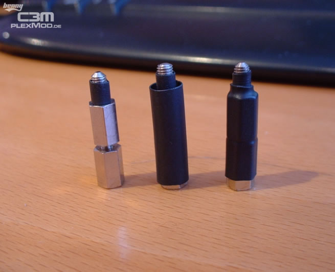 vorhin bzw. heute Nachmittag hatte ich mal mit der Grafikkarten Abdeckung angefangen, zuerst wollte ich mir kleine Plastikschrauben und Muttern holen, aber das wäre wieder so ne rumgurkerei gewesen, deswegen habe ich die normalen aus Metall genommen und mit Schrumpfschlauch versehen ;) .