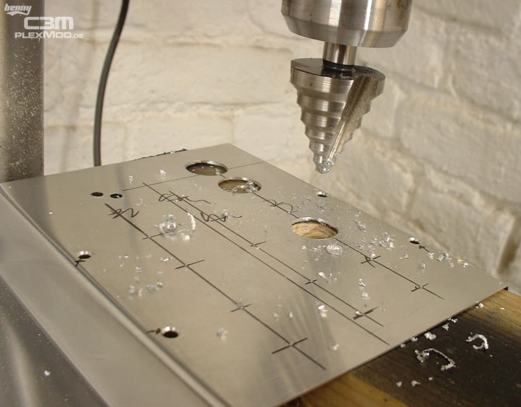 Hatte heut mittag mal bischen mit so nem Stufenbohrer von alfer experimentiert und damit die Löcher in die HDD Halterung gemacht.. jedoch war ich mit den kleinen Löchern unzufrieden und so entstand dann nochmal eine zweite HDD Halterung, mit größeren Löchern.. diese wird jetzt im C3M auch verbaut werden.