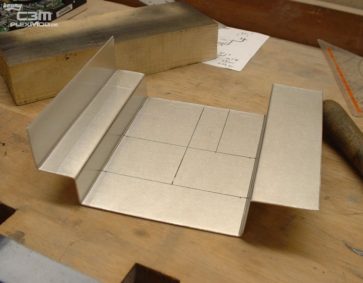 Und heut abend dann habe ich angefangen die Festplattenhalterung zu bauen, diese besteht im groben nur aus einem gekanteten Alublech, welches ich von unten mit der Festplatte verschrauben werde (muß morgen aber noch alles nachgearbeitet werden).