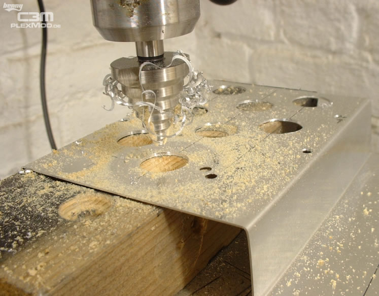 Hatte heut mittag mal bischen mit so nem Stufenbohrer von alfer experimentiert und damit die Löcher in die HDD Halterung gemacht.. jedoch war ich mit den kleinen Löchern unzufrieden und so entstand dann nochmal eine zweite HDD Halterung, mit größeren Löchern.. diese wird jetzt im C3M auch verbaut werden.