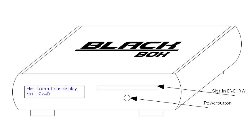 Die Box wird komplett schwarz, die front aus Plexy beklebt mit Spionfolie. Das Display kommt direkt hinter das plexy, so das man nur die schrift sieht. Der Slot vom Laufwerk, wird blau beleuchtet. Das Loch von der Aufschrift soll mit silbernen lochgitter hinterklebt werden und wahrscheinlich auch blau beleuchtet. Die füße werden wohl aus gebürsteten alu gemacht, ob ich da noch beleuchte, wird die Zeit mit sich bringen...