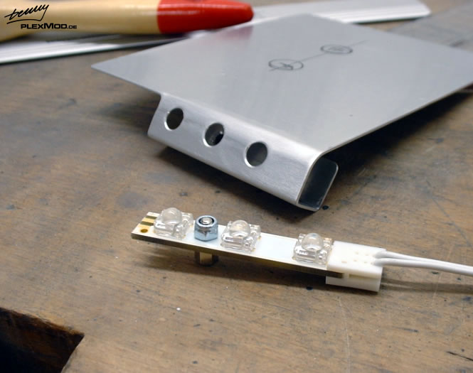 Danach ging es mit dem Alublech für die vordere Led Leiste weiter, ich habe hier einfach ein Blech so bearbeitet das es unter den Laufwerkskäfig geschraubt wird