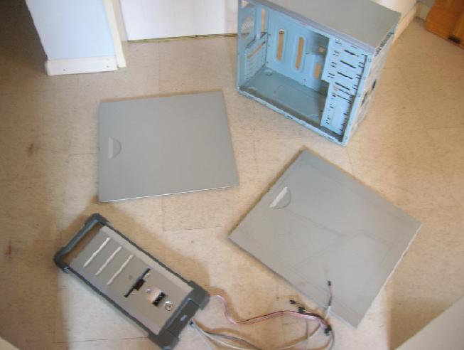 Es wir ein ganz normaler Casemod. Ich habe ein "altes" (2 Jahre alt) Gehäuse auseinander genommen und möchte erstmal die rechte Seitenwand (vom Gehäuse aus gesehen) auseinanderrupfen. Sprich diverse Formen ausschneiden (flexen, dremeln mal sehen...) und danach das ganze Gehäuse lackieren. Die beiden linken Formen (siehe 2. Bild) werden mit Plexi hinterlegen und mit Lüffis bestückt. Die rechte Form weiß ich noch nicht. Schwanke zwischen normalen Plexi, Lochblech oder ähnlichem. Naja mal sehen.