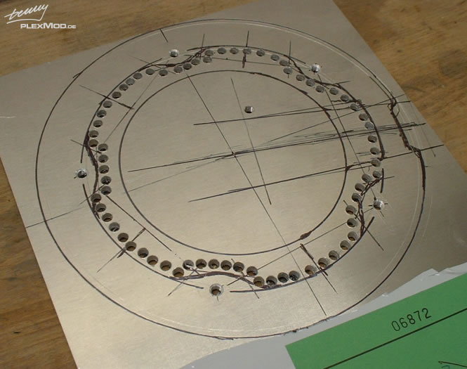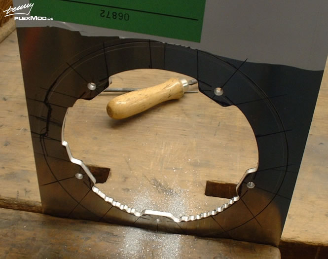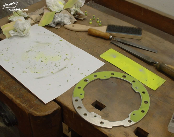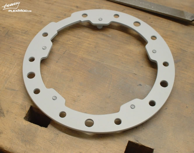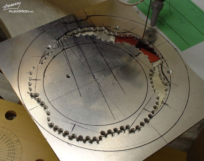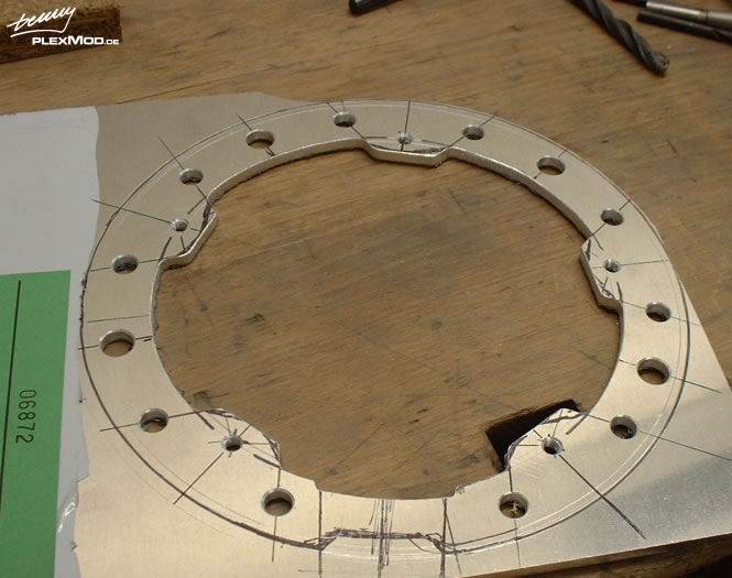 Habe erstmal heute die Größe des Ring festgelegt und Maße der Bohrungen übertragen, die Gewinde geschnitten (M5) und danach mittels vieler Löcher bohren und Dekupiersäge raussägen den inneren Teil aus dem späteren Ring entfernt.