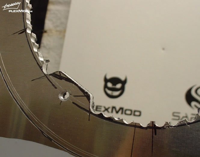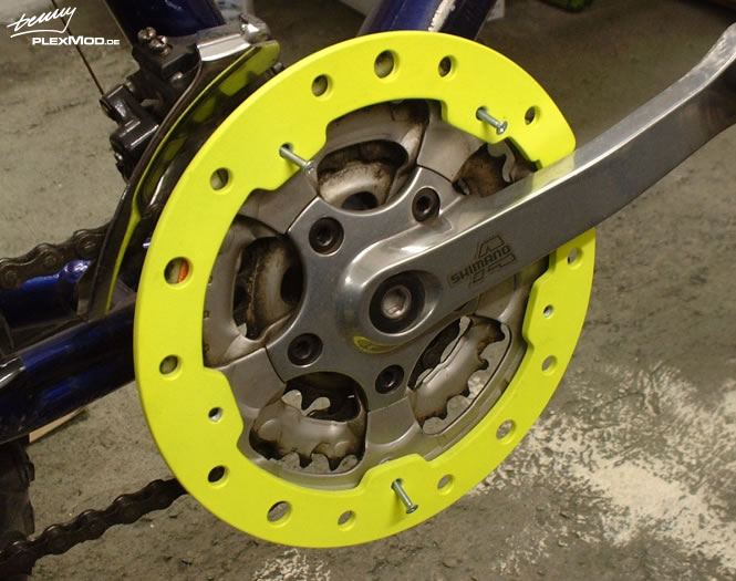 Da ich gerade keine Lust habe an der Innenverkleidung vom CM10 weiterzumachen und heute meine 4mm Aluplatten kamen, habe ich mich vorhin mal an den Kettenschutzring begeben welcher aus einer dieser 4mm Platten entstehen soll. Mit Kettenschutzring ist eine Abdeckung für die Zahnräder der Tretkurbel gemeint - ist ähnlich wie ein Rockring, nur wird dieser ja meist anstelle des dritten Kettenblatts montiert und ich schraube mir hier das ganze an das dritte Kettenblatt dran.