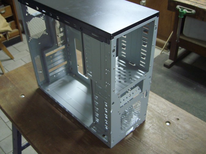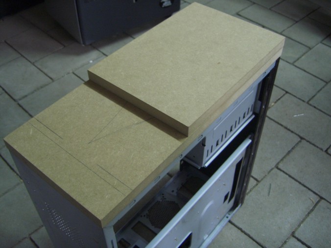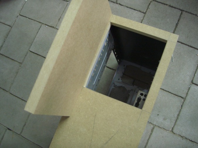 hab dann mal bissle am case rumgedremelt net viel ... nur vorne ne ausparung für den 120 er lüfter und dann noch so kleine gitter weggemacht die später mit lochblech ersetzt werden !(von dem rausgedremelten existieren noch keine bilder sry) dann noch den festplatten käfig weggemacht weil ich den ja nicht mehr brauche da meine festplatte mit anti-vibrationsdinger oben in die großen schächte kommt und diskettenlaufwerk hab ich auch rausgemacht ^^ ... joa und en bissle mit der mdf front angefangen