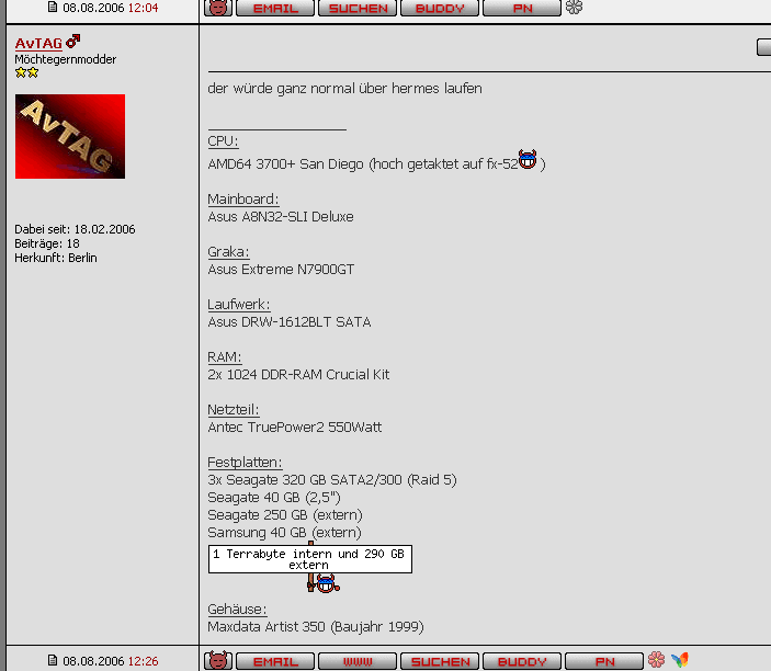 also wir haben nichts dagegen wenn ihr da Banner, Smilies etc. drin verwendet, aber diese dann bitte nur zu einer Höhe von sagen wir mal insg. ~100px und nicht länger wie so ein normaler Werbebanner (also so ~470px), der Übersicht halber. ![]()