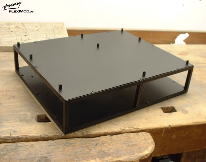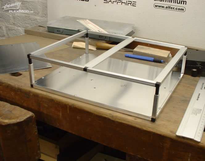 Hier dann schonmal paar Bilder vom Bau heut nachmittag.. morgen gehts weiter, dann wird noch seitlich ein Winkel zur Befestigung des Netzteils angebracht und alles schwarz lackiert... evtl. kommt noch eine Stütze in der Mitte, aber da muß ich erstmal noch schauen wie das mit dem DVD Laufwerk passt.