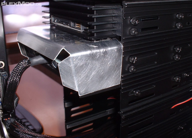 Die Konstruktion besteht aus zwei Teilen, zum einer einer Bodenplatte die unterhalb des Laufwerks in den Laufwerksschacht geschraubt wird und dann kommt quasi nur eine Haube (die ihr auf den nachfolgenden Bildern seht) darüber bzw. wird seitlich eingehakt (die Bodenplatte hat dort an beiden Seiten Schlitze).