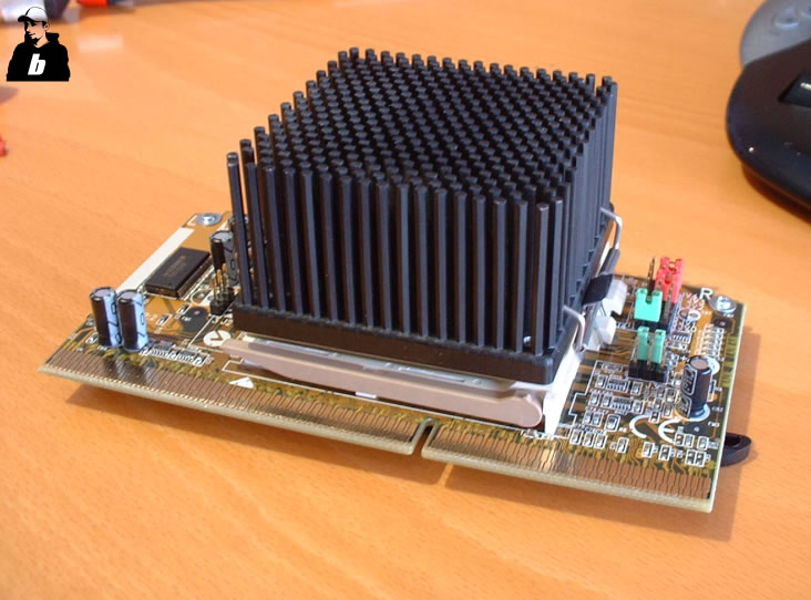 Dann den vorbereiteten Prozessor eingebaut (mit WLP und Kühler - ohne Lüfter (da der noch nicht hier ist)) und die Jumper so gut wie ich meinte eingestellt (1,5V / FSB 100...). Beim einschalten sprang der Rechner zwar an, aber es kam kein Bild. Also hin und her mit den Jumpern probiert.. aber nix rührte sich. Kühler wurde aber leicht warm im Lauf der Zeit.. also nen 80er Lüfter draufgelegt ;) .