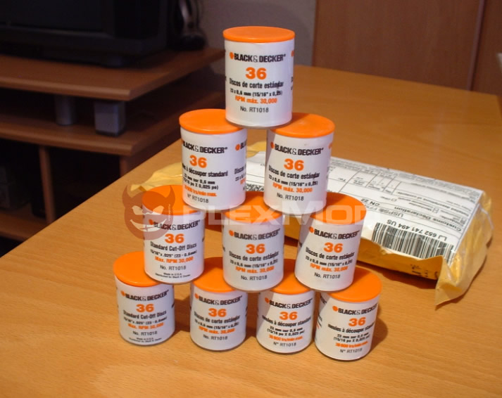Schließlich fand ich ein Angebot von 10 x 36 (also 360 Stück!) Black & Decker Trennscheiben (beworben als identisch zu den Dremel 409) für 19,79 US-Dollar