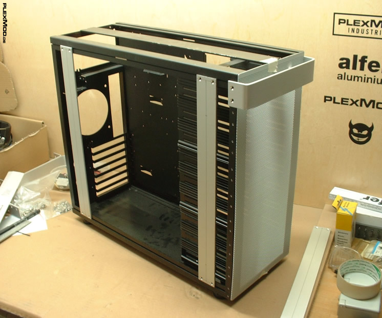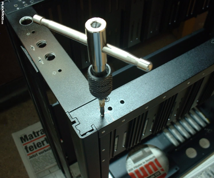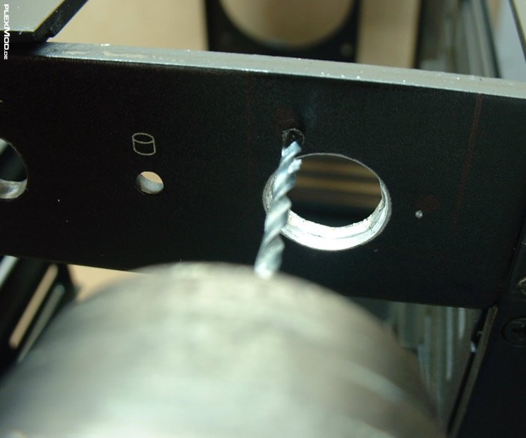 Am Gehäuse wurden dann im Frontbereich weitere Gewinde gebohrt, wo das Lochblech befestigt wird und um eine weitere Strebe im oberen Bereich (dort wo die ursprünglichen Taster waren) anzubringen.