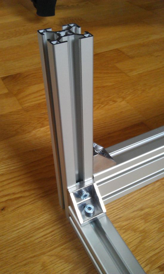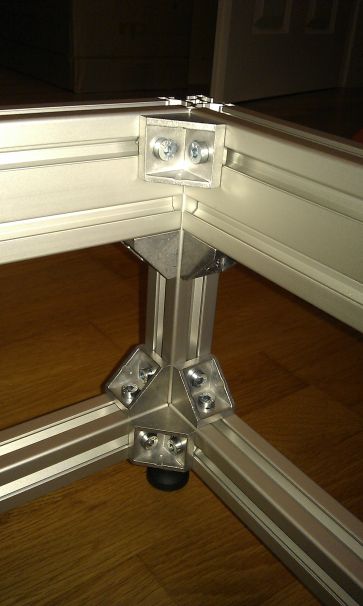Das Grundgestellt ist mit 30x30er Winkel miteinander verbunden. Befestig wurden die Winkel mit einer M6 Zylinderkopfschraube und Hammermutter mit M6 Gewinde. Um die Füße zubefestigen hab ich ein M8 Gewinde in das Alu Profil geschnitten.