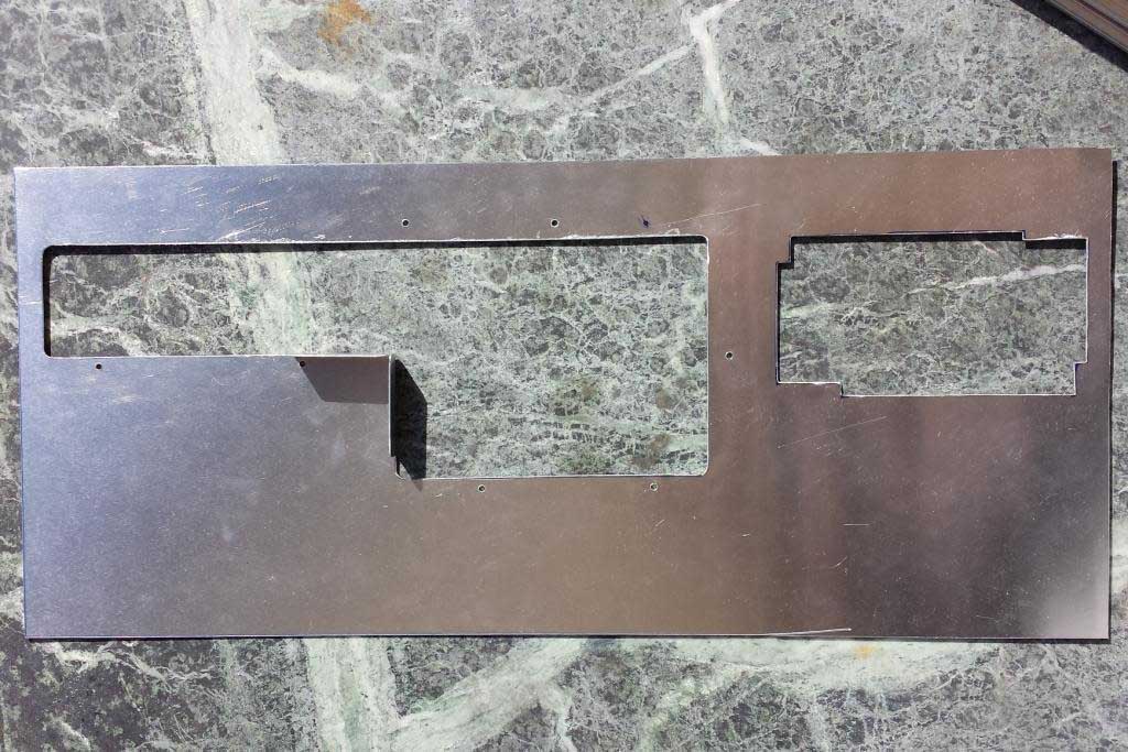 Jetzt wurde das Blech mit den Aussparungen zugeschnitten für das Mainboard und Netzteil. Das NT habe ich bewusst Aufrecht gestellt, damit die geringe Wärme der Festplatten und DVD-Rom nach außen transportiert wird.