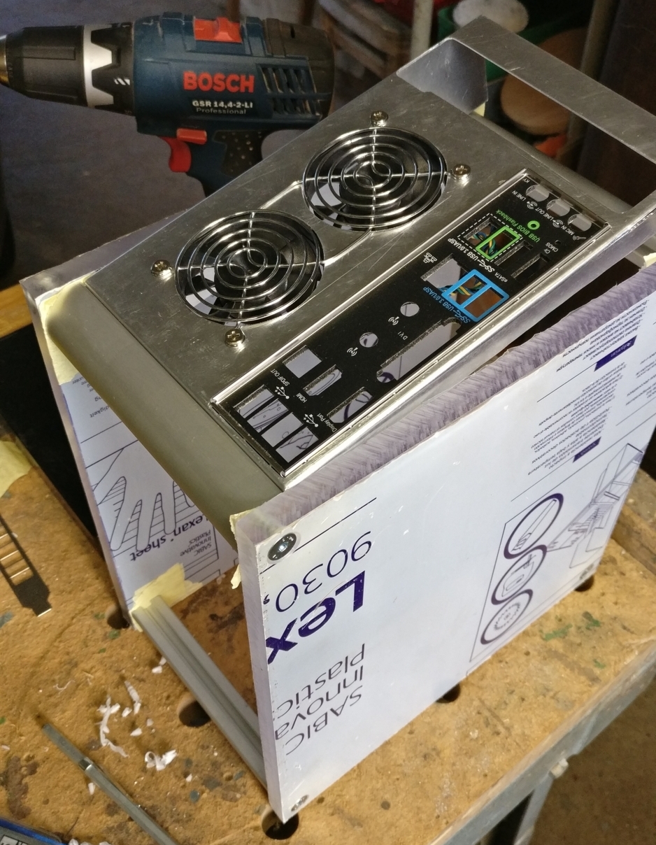 Das Gehäuse wird nicht sonderlich komplex werden. Dazu fehlen mir einfach die Mittel bzw die Zeit und Geduld. Vom Prinzip packe ich die Hardware sandwichmäßig zwischen zwei Lexanplatten. An den Ecken sitzen Aluprofile als Distanzstücke und die Seiten werden mit Blechen verkleidet.