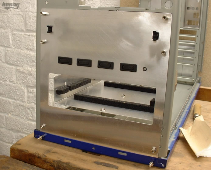 Die Öffnung ist rundherum ca. 5mm größer als das Laufwerk, damit dieses hinterher nicht miteinander in Berührung kommt - weil was bringts mir, wenn ich das Laufwerk hinten in Schaumstoff packe (das hält nämlich auch ohne festschrauben dort sehr gut) und vorne vibrierts am Alu, da kommt dann hinterher noch Moosgummi rundherum von innen, so das man den Spalt nicht mehr einsehen kann.Wobei das Alu, nochmal einbischen geschliffen werden muß, da sind noch paar kleine Wellen in der Öffnung.