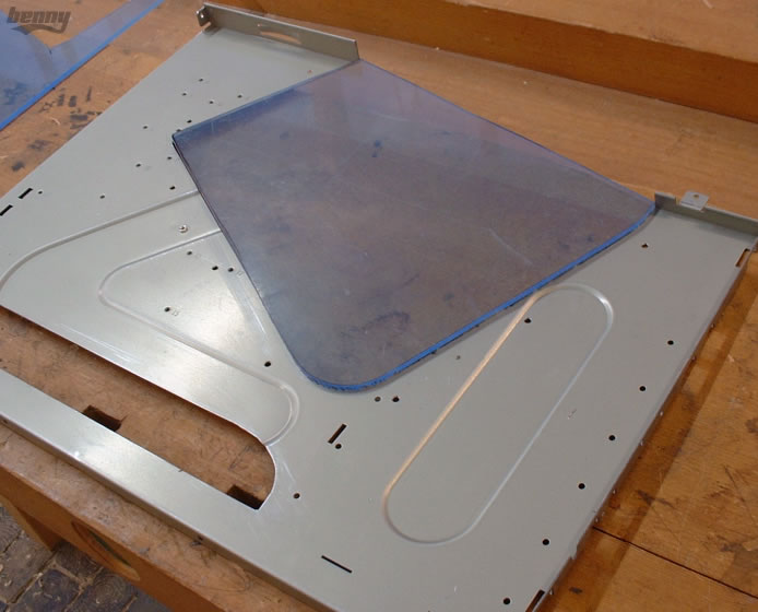 also die Form des Ausschnitts im Blech auf das Plexi übertragen und dann das an ner Bandsäge (die leider net mir gehört) ausgesägt, muß natürlich alles noch sauber nachgefeilt und angepasst werden, das kommt dann morgen dran. -