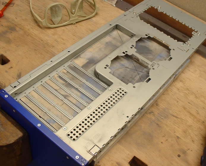 eigentlich sollte ich ja im bett liegen ..hab aber vorhin mal bischen schonmal angefangen die Rückseite zu bearbeiten, die wird erstmal nur glatt gemacht, so das ich dort ein Alublech einfach draufsetzen kann - deswegen wurden die Lüftergitter auch nur so "billig" rausgetrennt (ok werden noch bischen an den Kanten entgratet aber mehr nicht), weil die sieht man hinterher eh nimmer.