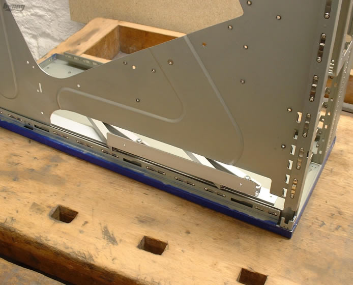 Dann habe ich im Gehäuseboden noch ein paar zusätzliche Bohrungen gemacht, dort wird noch ein Profil platziert werden, welches die Gelenke der Seitenteile auseinanderhält und zusätzlich die Möglichkeit zur besseren Montage eines doppelten Bodens bietet.