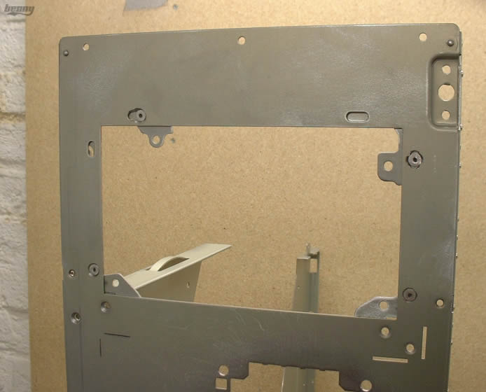 zum einen habe ich in dem Mainboardblech die Öffnung für das Seitenteilgelenk herausgearbeitet, dann die Netzteilblende hinten zuerst von den hässlichen kleinen "Pinnen" befreit und dann anschließend fest am Gehäuse vernietet (wodurch ich dann schonmal vier Schrauben dort weniger hatte - evtl. ist es auch doppeltgemoppelt gewesen, weil ich das Alublech auf die Rückseite die Tage wieder durchgehend machen werde und somit die Blende eigenlich überflüssig ist. .aber ach passt schon ;) )