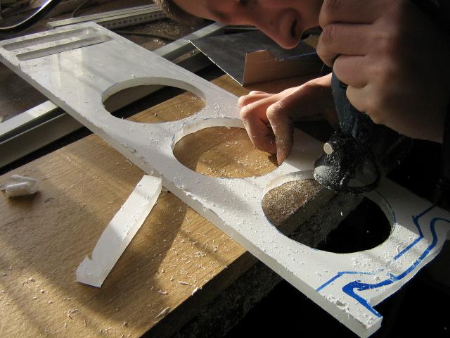 Don hat das plexi für die front geschnitten (das 10mm) und bearbeitet, dann noch das Plexi fürs window ausgeschnitten, und löcher für die vandalismusstaster in den decken gebohrt
