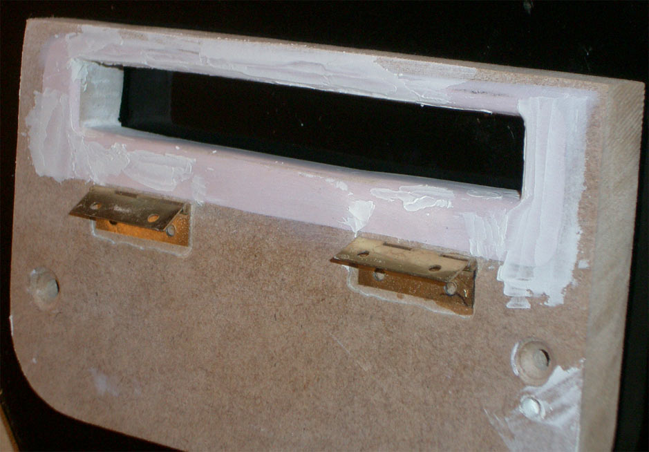Bild 1: Das ist die Laufwerksfront. Hatte zuvor eine Vertiefung für die Blende reingefräst, da mir das aber nicht gefiel, habe ich die zugespachtelt. Für die Scharniere hab ich jeweils die Dicke weggefräst und mit Sekundenkleber befestigt.