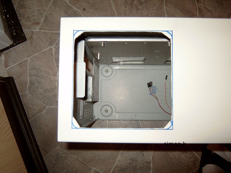 Zu sehen gibts, einmal die montierten Seitenteile und andererseits die Rückwand. Auf der Rückwand sieht man die "Sichtlinie" d.h. die oberste Grenze von dem was man sehen kann. Alles andere was blau eingekreist oder schraffiert ist kommt weg.