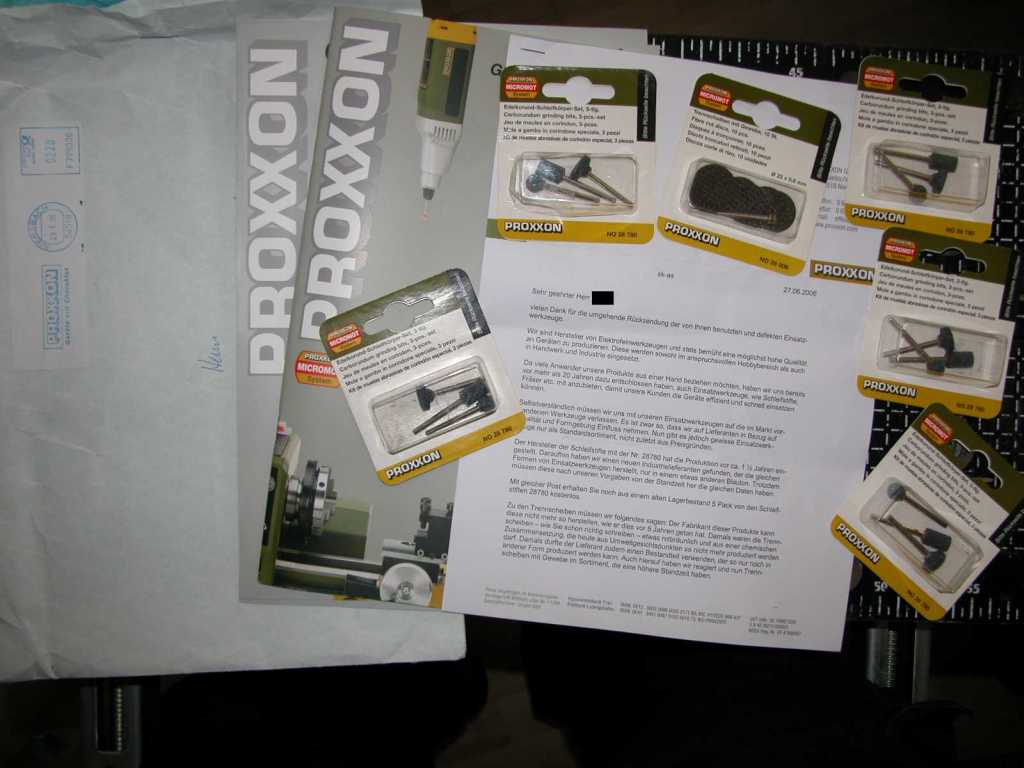 juhu...hab heute morgen post von PROXXON bekommen, die mit einem geschenkpaket auf meine beschwerde reagierten.
