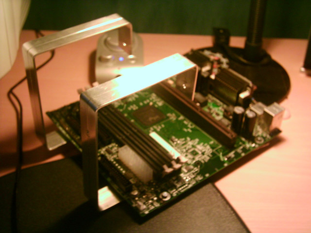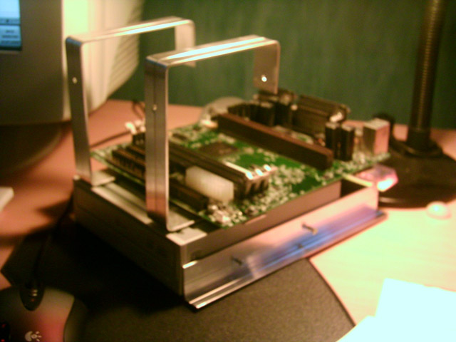 so bin heute auch nicht untätig gewesen: ich habe aus einem stück blech (danke an thelinne, der mir das blech vorbei gebracht hat) ein verbindungsstück zwischen laufwerk und mainboardhalterung gebaut, undd as wars eigendlich auch schon, ohne die bestellten teile bin ich momentan leider relativ machtlos