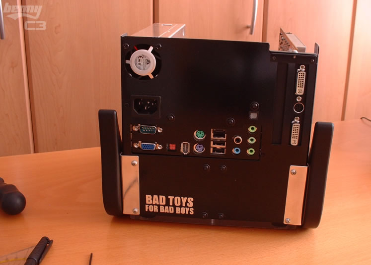 So habe ich jetzt die beiden Slotöffnungen hinten zu :) ...allerdings habe ich mich bischen vermessen.. die Graka Öffnung war vorher nur für ne Karte mit einem DVI und einem VGA Anschluß vorgesehen *g* deswegen passt die untere Schraube des zweiten DVI nicht dran - aber das war's mir jetzt auch nicht wert nochmals alles auszubauen, zu bearbeiten, nachzulackieren usw. ;)