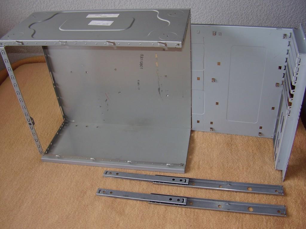 den Mainboardschlitten habe ich aus einem alten Gehäuse genommen, das ich noch auf dem Dachboden rumfahren hatte..die Festplatten kommen auf die Rückseite des Schlittens...