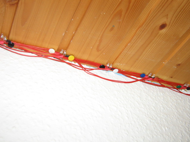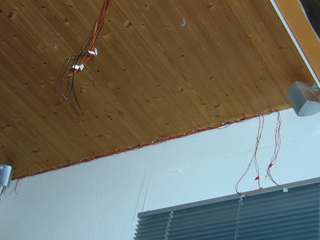 So, weiter im Programm, am Wochenende hab ich nicht das Meiste geschafft und ich liege jetzt zeitplanmäßig etwas im Rückstand. Macht aber nix, hab grade noch ein wenig getan und jetzt ist auch die gegenüberliegende Deckenseite verkabelt. Beweisfoto hab ich gemacht