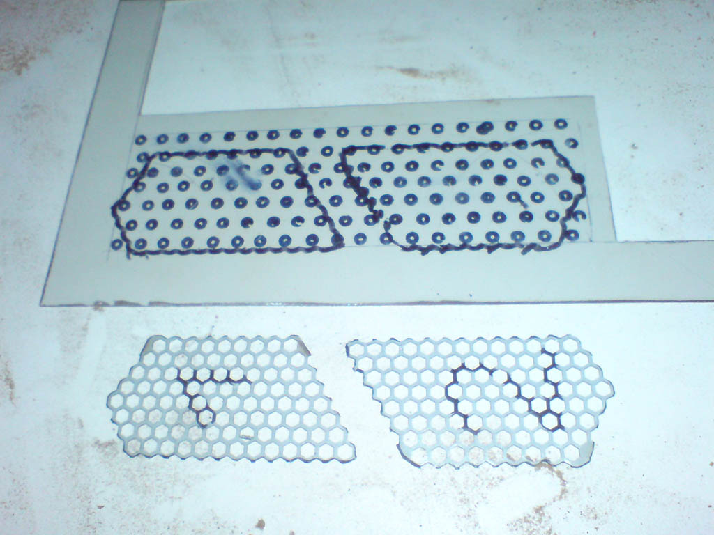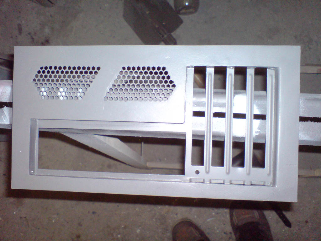 Aus einem 80er Lüftergitter (danke@Tim) entstanden zwei Luftauslässe die im Heck untergebracht werden. Zuerst zugeschnitten, dann die Umrisse übertragen und dann mittels Standbohrmaschine und Dremel herausgetrennt. Anschließend hab ich das mit Feilen bearbeitet, so dass die Auslässe eingelassen werden können. Das Ganze wird dann, wenn ich's schaffe, heute verschweißt.