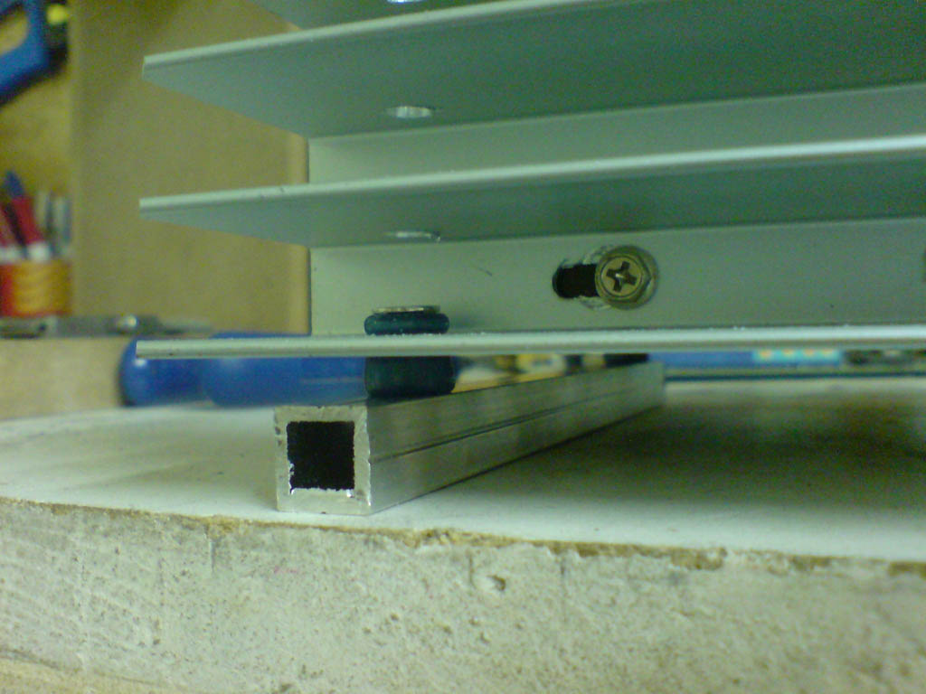 Ich hab nun den HDD Käfig/Kühler zusammengebaut. Das war irgendein Kühlkörper, den ich bei eBay für 1€+Versand ersteigert habe. Die Entkopplungen stammen aus einem alten CD-Rom. Die Halter für LW und HDD-Kühler hab ich aus 2x20mm Flachstangen gebogen.