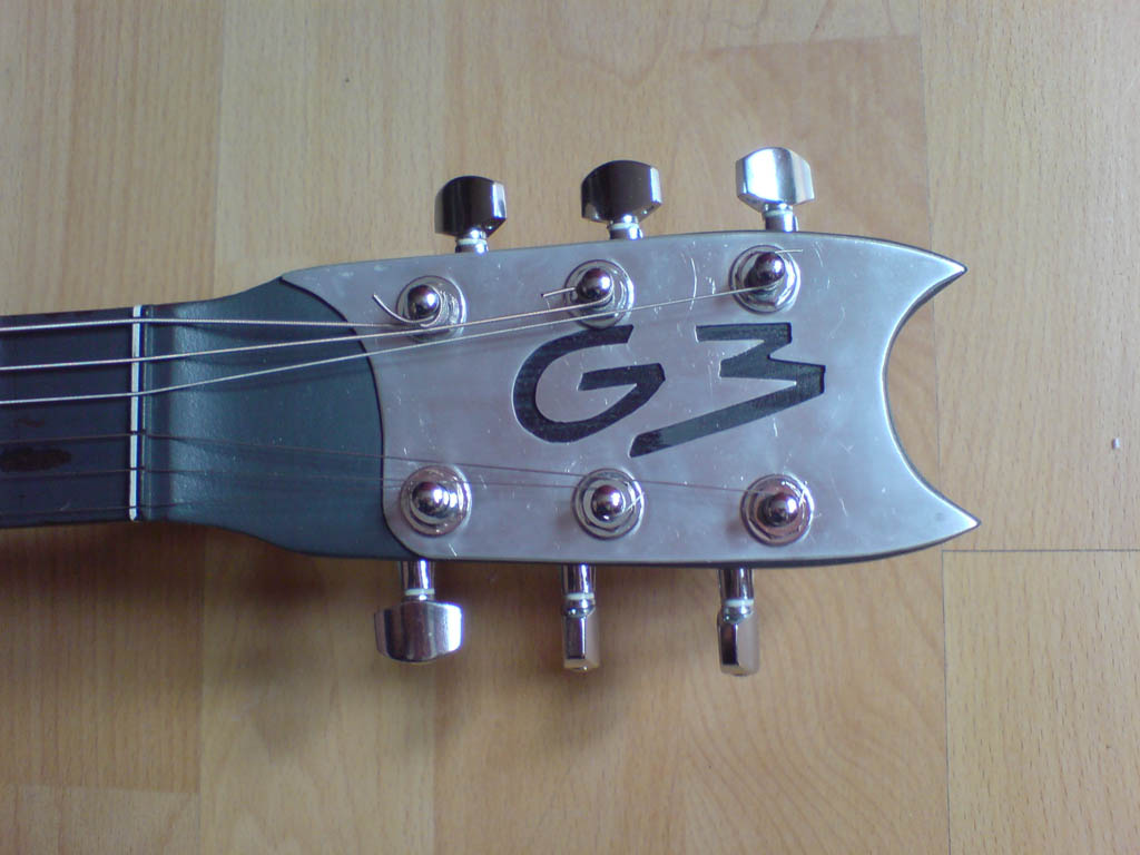 - Die Kopfplatte wurde von eckig auf "evil" getrimmt und mit einer Aluabdeckung versehen. Das G3 steht für meine dritte Gitarre.