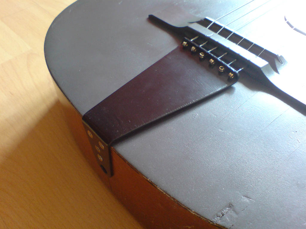 - Da Metallsaiten aufgrund höherer Spannung nicht für eine Konzertgitarre geeignet sind, hat sich die Bridge verbogen und die Decke mit verformt. Ich hatte etwas Angst, dass das irgendwann reißt. Deshalb kam ein neuer Saitenhalter aus 2mm Stahlblech, der hinten am Korpus befestigt ist. Die Bridge führt nur noch die Saiten.