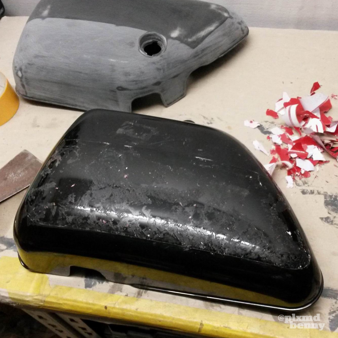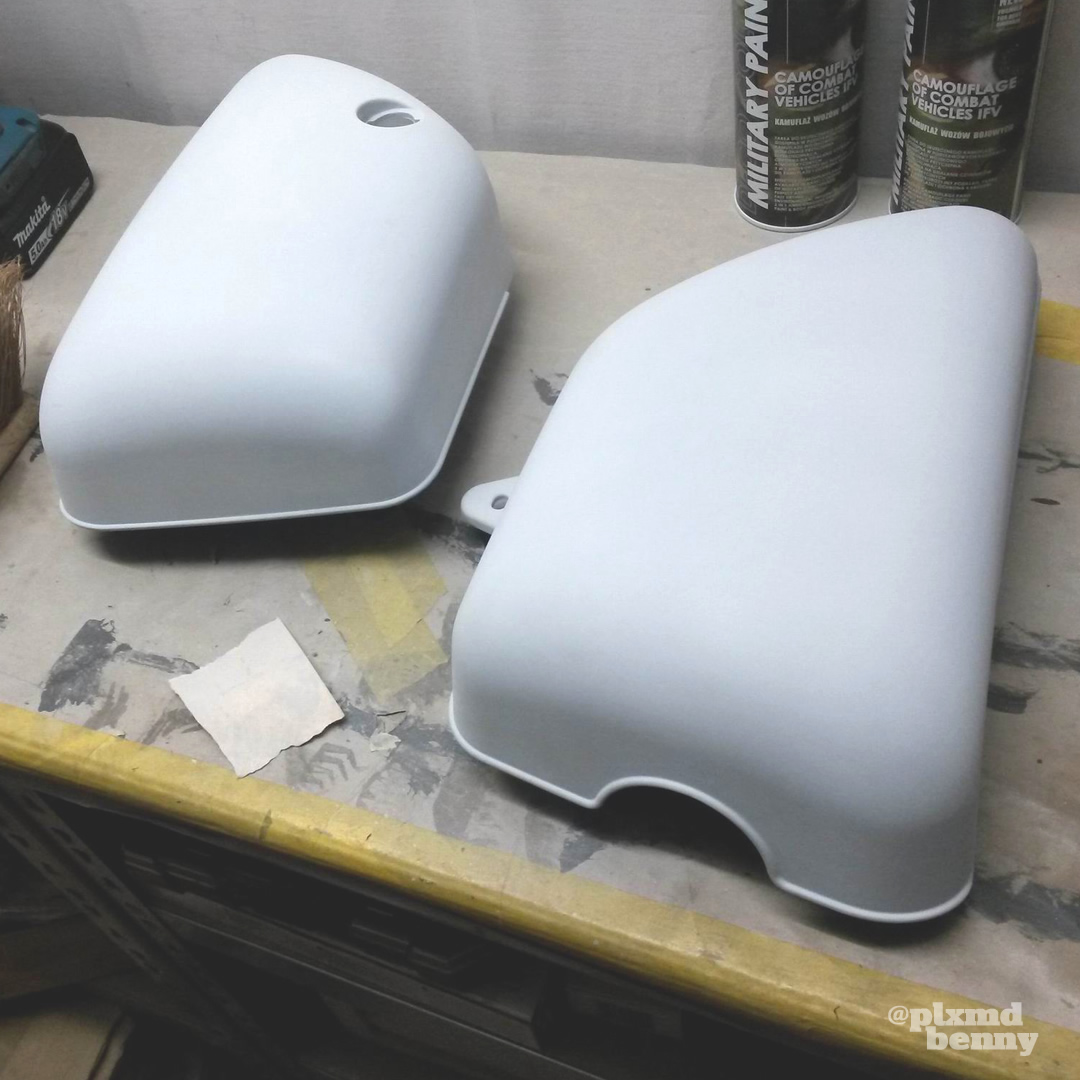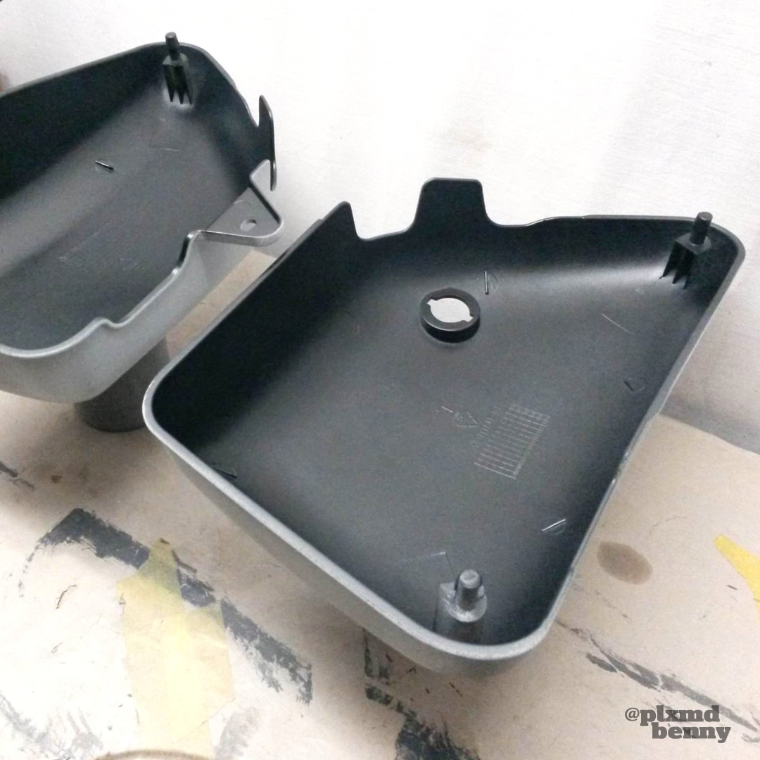 Die Innenseiten habe ich dann erst in matt dunkelgrau, anschließend in matt schwarz lackiert, weil man je nach Blickwinkel wenn man vor dem Moped steht später in die Seitenteilabdeckungen schauen kann und das soll einfach nur dunkel sein.