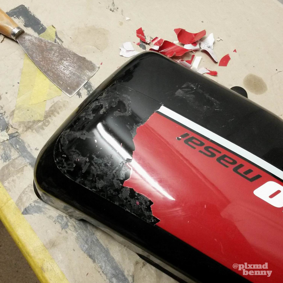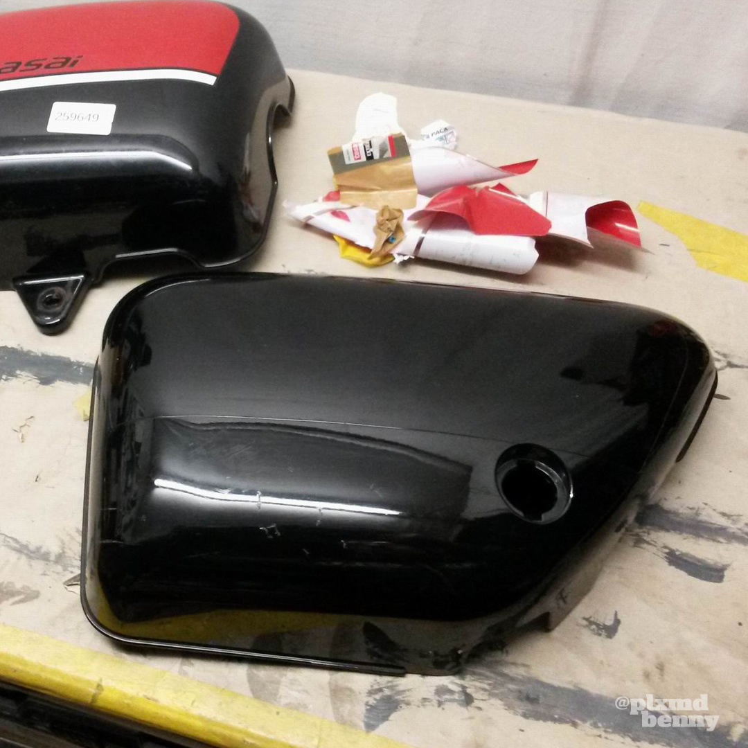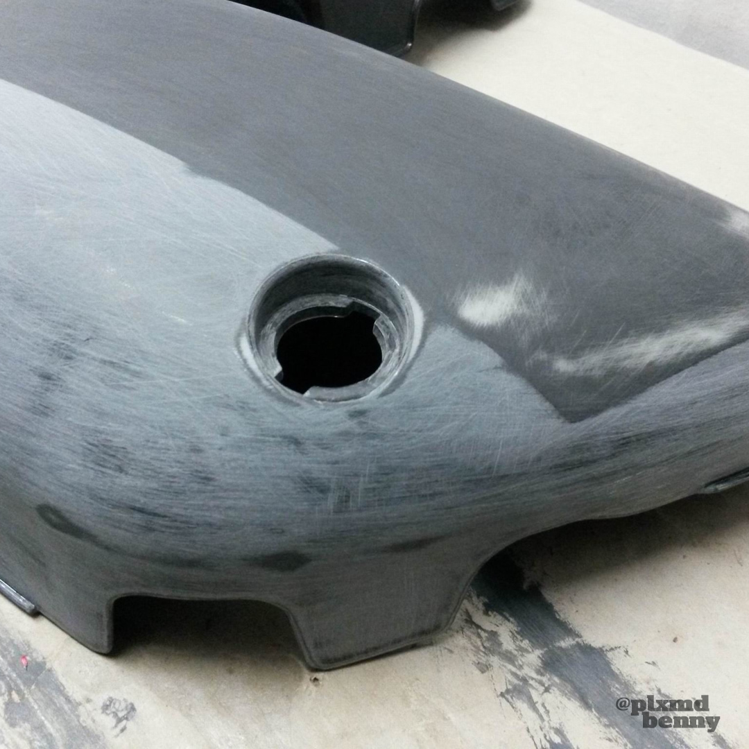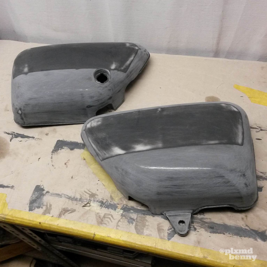 Die Innenseiten habe ich dann erst in matt dunkelgrau, anschließend in matt schwarz lackiert, weil man je nach Blickwinkel wenn man vor dem Moped steht später in die Seitenteilabdeckungen schauen kann und das soll einfach nur dunkel sein.