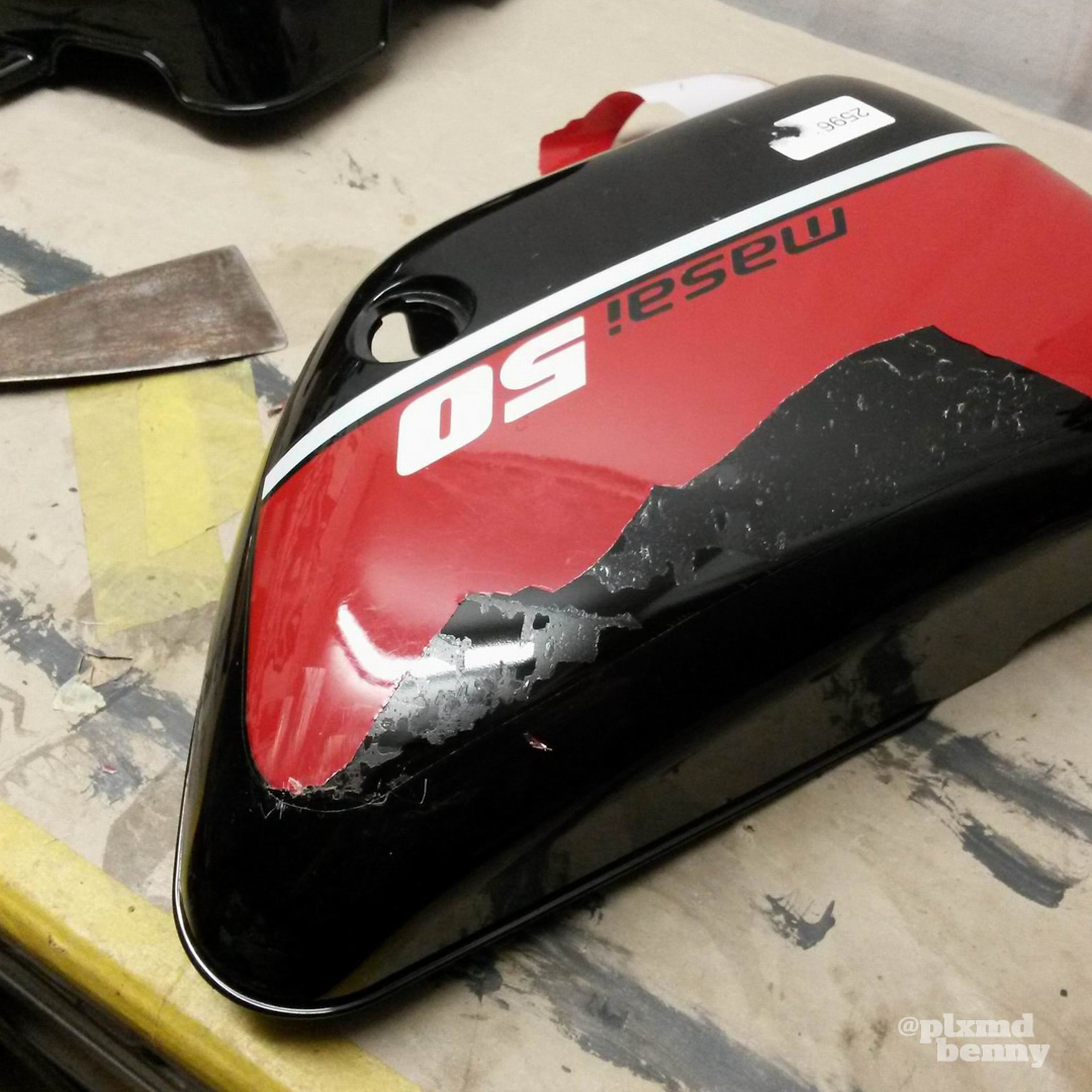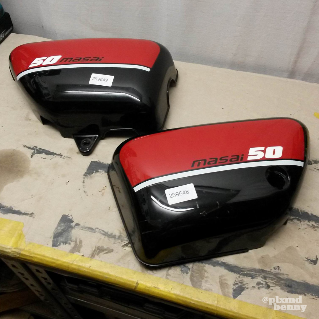 Ein paar Tage später hatte ich dann ein Paket aus Frankreich vor mir stehen, mit den Seitenabdeckungen besagter Masai 50.