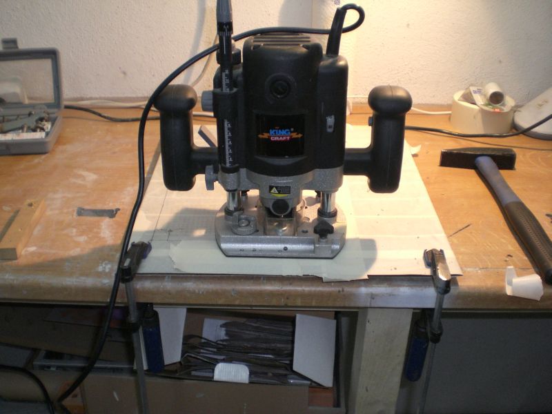 Dann in den Mittelpunkt des gewünschten Radius ein 5mm Loch gebohrt und einen Stift reingeschlagen, und darauf die Fräse gesetzt. Sieht dann etwa so aus: