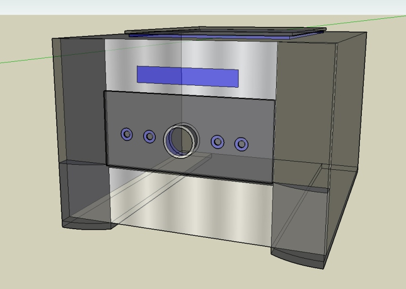 Nach langen Grübeleien ist jetzt der folgende Entwurf dabei heraus gekommen. Da man bei der schwarzen Farbe die Formen nicht so gut erkennen kann, habe ich noch einen X-Ray-View dazugestellt. Alle schwarzen Elemente sollen später in schwarz glänzend lackiert werden (gefertigt aus MDF, alfer connect Profilen). Die Metallbereich auf der Front entweder Alu oder Edelstahl. Das blaue Rechteck wird ein 4X40 LCD, das mit dem schwarzen Frontelement verdeckt werden kann (durch Drehen des großen Reglers fährt dieses nach oben), damit alles etwas dezenter leuchtet.