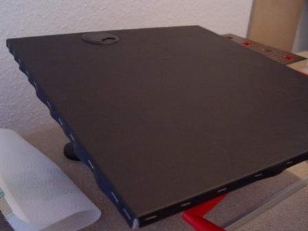 Bei Conrad habe ich mir in der Autozubehörabteilung schwarzes Kunstleder für die Oberflächenbeschichtung besorgt. Ordentlich Sprühkleber aufgetragen, vorsichtig abgerollt, fest angedrückt und über Nacht trocknen lassen.