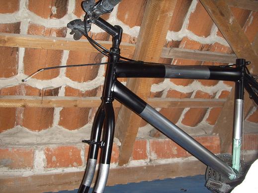 Es ist eigentlich ein Mountenbike das normal eigentlich ne "komische Grüne" lackierung hat. Nun hatte ich vor 4 oder 5 jahren mal die Farbe satt deswegen hatte ich es Matt Schwarz lackiert aber ohne Klarlack durch die 4-5 jahre is dann langsam der schwarze lack abgesprungen und ne menge Kratzer so das man den alten Grünen lack wieder sieht.