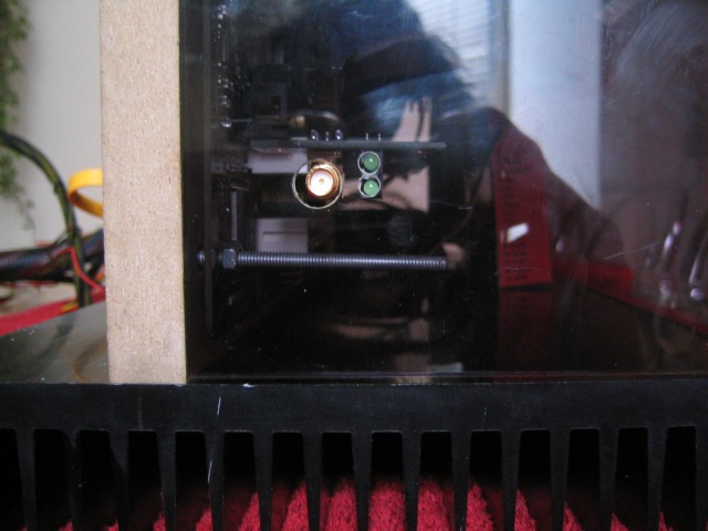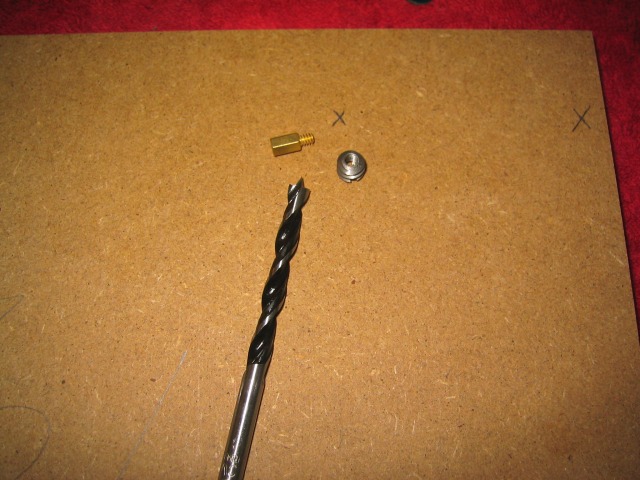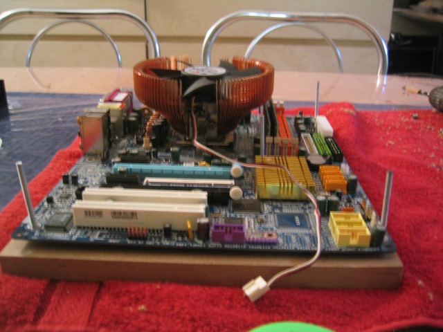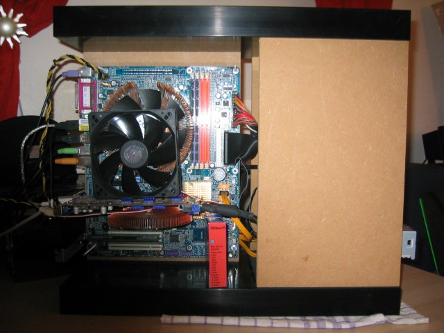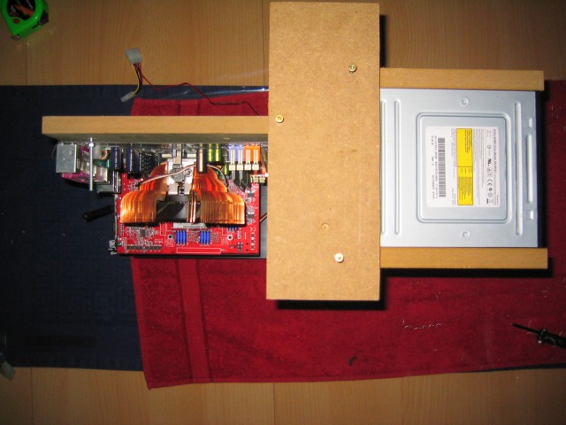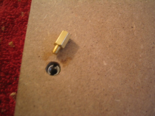 1.) das mobo aufgesteckt, über die 4 gewinde kommen dann später muttern! zw. mobo und mdf platte ein abstandhalter. die restl. "goldenen" abstandhalter sind bereits eingedreht. (allerdings noch nicht fix angeschraubt... ist ja nur ein tesltauf)