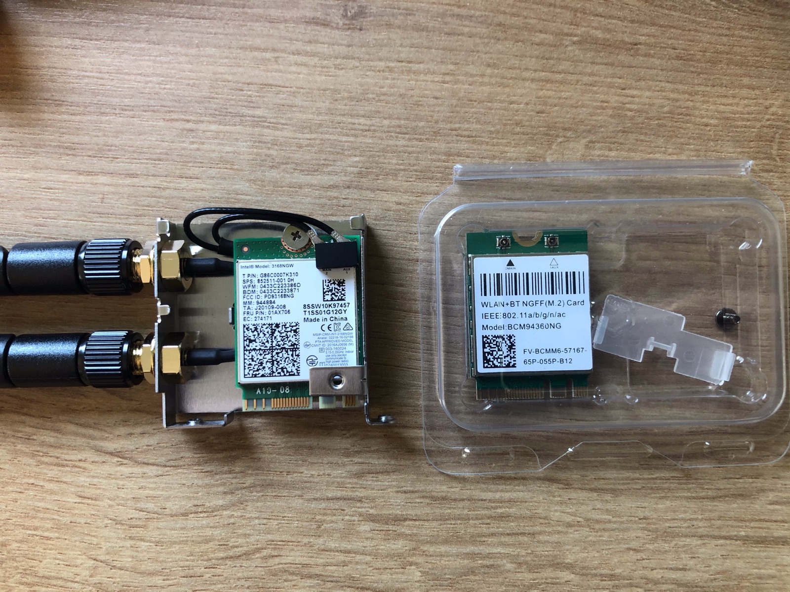 Links das alte, rechts das neue was kurzerhand in diesen Metallträger vom Mainboard eingesetzt werden konnte. War ein bisschen frickelig mit den Antennenkabeln auf dem kleinen Raum, aber nichts was sich nicht lösen lässt.