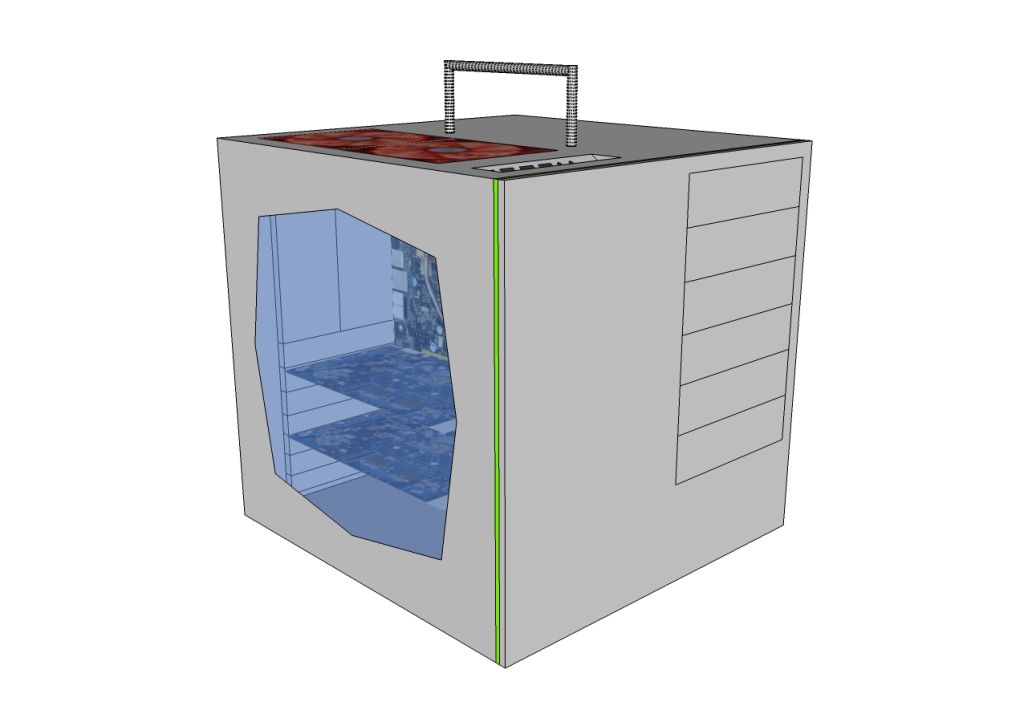 des weiteren habe ich mir überlegt die seitenteile unten am gehäuse mit scharnieren fest zu nieten, sodass sie einen besseren zugriff auf die hardware bieten und nicht immer durch die gegend fliegen, wenn man einen hardware-tausch vornimmt. in der sketch-up zeichnung ist nicht eingezeichnet, dass das gehäuse bis zum griff auf der deckelmitte aufklappbar ist (die idee ist mir erst jetzt gerade gekommen).