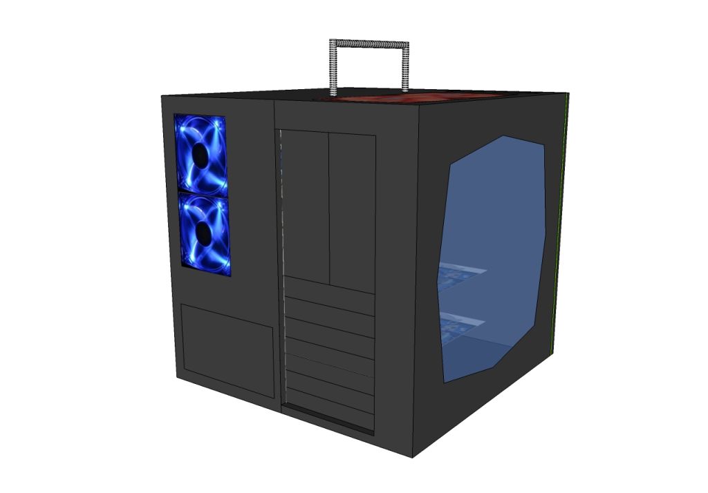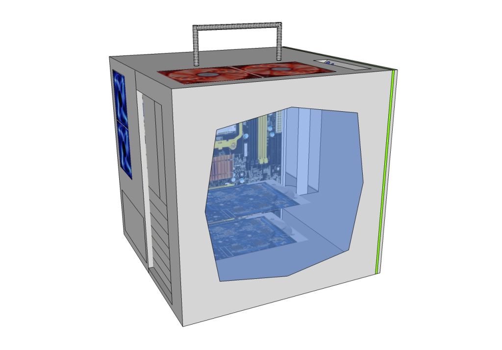 das design richtet sich nach dem kühl konzept (zwei 12cm lüfter für die luftzufuhr und zwei 8cm lüfter sowie das netzteil für die warmluft abfuhr) und ich habe versucht das gehäuse so niedrig wie möglich zu konstruieren und eine realistische würfelform zu erhalten. ich möchte eigentlich noch mehr lichteffekte (also led's) verschiedener farben in den cube integrieren.