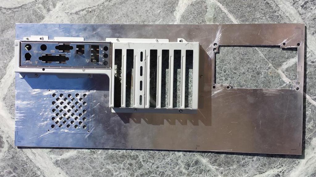 Jetzt wurde das Blech mit den Aussparungen zugeschnitten für das Mainboard und Netzteil. Das NT habe ich bewusst Aufrecht gestellt, damit die geringe Wärme der Festplatten und DVD-Rom nach außen transportiert wird.